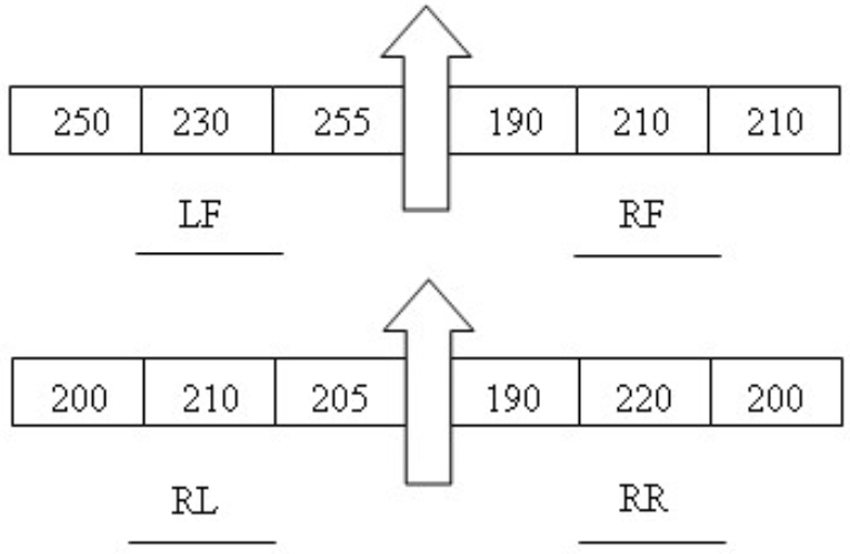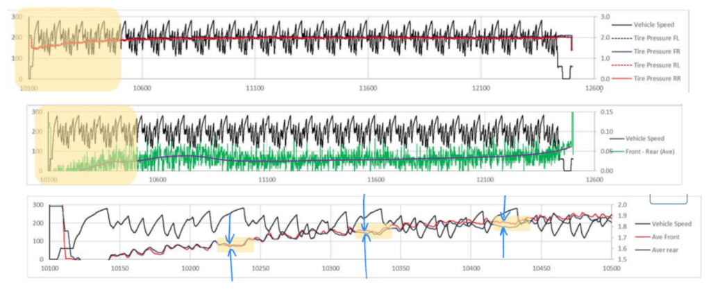 Figure 7 illustrates an outing of three laps and also how the tire pressure variate along the track and laps. This variation is due to the alternations of the load transfer during the consecutive cycles of re-acceleration, braking and cornering. By Figure 7 it is also possible to visualize the difference between the pressure evolution during the outing. In the first lap the front and rear tire pressure are practically equal. However, after the second lap it is possible to notice the increase on the average front pressure relative to the average rear ones. This is clear in the third lap, which is clear the gap between average pressure in the front and rear tire pressures. The gap may is a clue of some situations. First, the car may have a setup which is too understeering, which makes the front tires have an exagerated increase in the temperature, the pressure and the wear, thus a reduction of the contact patch. In the end of the outing it is possible to visualize a strange temperature peak. This occurs due to the heat soak. Although the tires are constantly being stimulated to gain heat, there is just an increase pressure while in temperature this is not seen. Instead constant cycles of increasing and decreasing suggest that pressure and temperature variation reach a steady-state process. However, what really occurs is the reduction of the tread thickness. The tread is responsible for the tire grip and the flash temperature. As the tread slides over the road, the friction and the slip angle α generates heat, temperature and grip. This heat is transferred to the sidewalls and to the rim. This is heated up and transfer its heat to the inflation air inside the tire. The air becomes hotter and expands, this deformation stresses the sidewalls and reduce the contact patch. This helps to increase the temperature at the contact patch. As the tread is being consumed, less and less rubber is on the tread and thus less means to exchang heat to the inflation air. Therefore the tire starts to cool and lose grip.