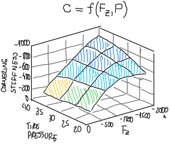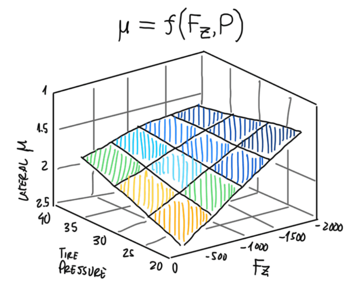 As the tire performance depends of the pressure, it is possible to evaluate how this parameter results in variations of the tire performance. Two parameters are mainly correlated, the cornering stiffness (C) and the lateral friction coefficient (μlat). In fact these are a kind of overview of how capable a tire to provide grip in a cornering situation. The first, cornering stiffness is correlated with the vertical force (Fz) and tire pressure (P). As can be observed on Figure 8, the correlation of P and C can not be defined alone, it must be done also verifying the effects of Fz. Hence it can be established that when Fz is low, the effect of P in C is almost insignificant. This situation is usually seen in maneuvers at very low speed, as in parking lots. These are characterized by very small slip angle α or null ones. However, as the maneuver is being performed at a higher speed, Fz naturally increases. At this situation the effect of P is clear. As P increases, C also increases. This means high speed corners, line change maneuvers and slalon tests. These movement are characterized by a significative value of α. The effect on the vehicle is, as P increases at high Fz maneuvers, C tends to increase. At same Fz, but with lower P, C decreases. This means that α are required to produce grip. Hence, lowering P increases temperature, hysteresis, grip, but also increases the thread wear and the drivers effort on the steering wheel.