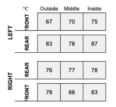Tire temperatures are measured during a pit-stop, according to Figure 12 it is possible to make the following observations about front left tire (FL):