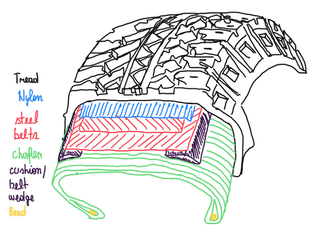 The tire carcass has several parts (Figure 1) made from different materials, not only rubber. Although the tread is highly important due to the grip generation, it request some support to reduced its deformation during operation. The main component in charge of this function are the steel belts. Their function is to keep the tread surface as it should be. In addition it is also good for the improvement of the torsional stiffness of the tread. The steel belts are based in steel wires that in their composition there are Mn, Si, Ph, S, Cu, Cr, Ni and Zn. The cooper (Cu) became added to work as chemical adherent for the metal chords of the carcass, because rubber does not adhere spontaneously on the steel wires. In terms of composites, the rubber would be the resin and wires would be the fibbers. Along the years new kinds of wires were