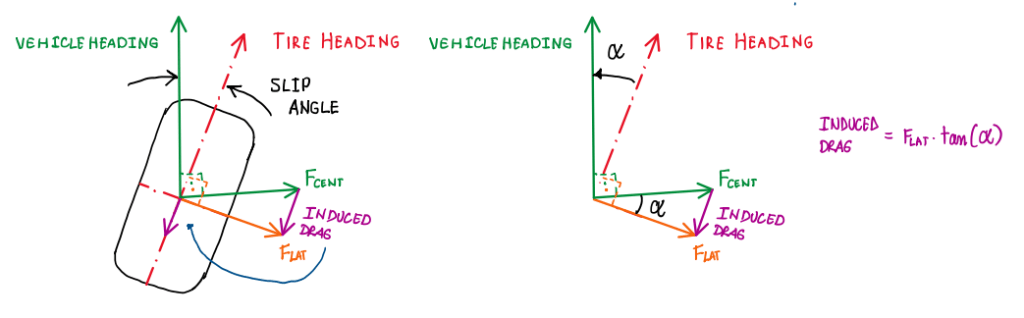As can be seen on Figure 11, the induced drag is a consequence of α developed by the tire when it is steered. Since the vehicle has a centripetal force (Fcet) component perpendicular to the car, Flat component biased at an angle α from Fcent generates the induced drag. This name is given due to the similarity with the aerodynamic lift and the angle of attack. However, induced drag is a kind of rolling resistance that only comes to play when the tire develops the slip angle.