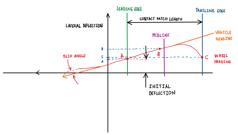 Figure 5 describes the lateral deformation of the tread, that at some point it is distorted due to the same wheel steer angle δ. The orange line is the vehicle heading, which is the line of the zero deformation. This line makes an angle with the red curved line, which is the slip angle α. If a single point on the tread surface is followed, it is possible to observe how the lateral deformation is developed. At point A, the lateral deformation is already started, but it still is at the linear range. The only difference is that when a portion of the tread reaches the point A, it is at the leading edge of the contact path. Although the belt and the tread are made from stiff materials, they allow some degrees of compliance. For this reason, some portion of the tread is already distorted before the contact with the ground due to the effect of the weight and wheel loads. When the section under observation is going to the point B, the tread still is adhered to the asphalt, thus the deformation still occurs linearly. At point B the tread begins to slide, because the force required to deflect the tread exceeds the local friction coefficient times the wheel load (static plus dynamic one). Finally, at point C, the portion under observation rotates out of the contact patch following the wheel heading. Although the distortion is reduced, there is still some deformation, which results in α, thus generating Fy.