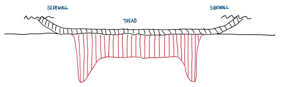 occurs due to the tread and sidewall bending stiffness. It increases the contact pressure at the leading edge.