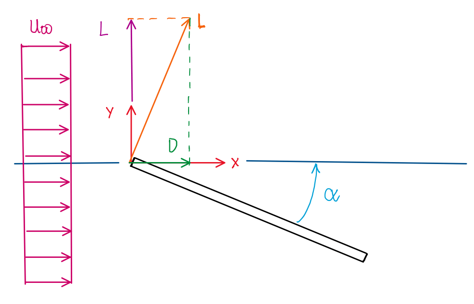 At this point the exercise became a little bit complex, the flat plate is rotated about z axis. The angle of attack produced is α = – 0.1 rad in order to generate a lift L = 180 N. In addition, the flat plate is assumed to behave as elliptical wing. The questions are to calculate the induced (4) and the form drag (5). To understand how to arrive at these angles it is important to know the basic angles of wing, as illustrated at Figure.
