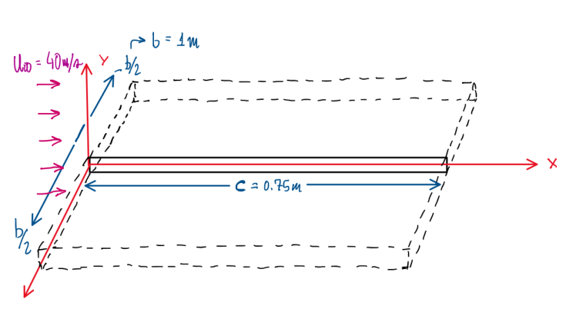 A flat plate is imersed in : an airflow of u∞ = 40 m/s, it has a spanwise b = 1 m, a chord c = 0.75 and it is placed paralelly to the airflow, x-axis. The y-axis is pointing upwards. The x = 0 coordinate is at flat plate leading edge, while the coordinate x = c coincide with the trailing edge. The spanwise coordinate z ranges from -b/2 to b/2 respective to the wing edges. This exercise is divided in three sections.