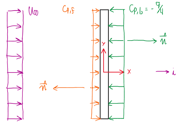 The pressure coefficient at the base CP,b = – 7/4 and the drag coefficient CD = 2.0. In this case, a plate at 90°, it is possible to assume that CD is the resultant between pressure coefficient at the front and at the base, thus: