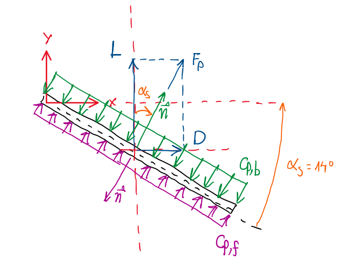 D = Df + Db = q∞∙CP,f∙sin(α)∙c – q∞∙CP,b∙sin(α)∙c = q∞∙cos(α)∙c ∙ (CP,f – CP,b)