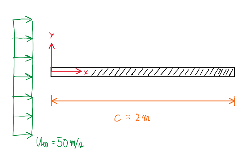 Considering an airflow which has a free stream velocity U∞ = 50 m/s and has an immersed flat plate exhibiting a stall condition. The reference system has x and y are parallel and vertical to the flat plate, respectively. In addition, the origin of the reference system coincide with the leading edge of the flat plate. There are two another coordinate frames, 1 and 2. The first establishes that x1 has a flow attached and with a velocity profile of: