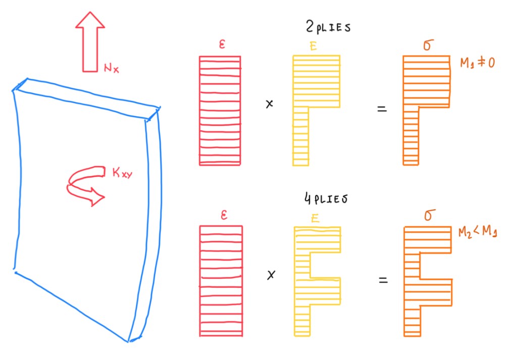 For the designation of coupling, for instance, the membrane strain, torsional or twisted curvature, its reason is qualitatively explained in Figure 1. For example, the membrane strain non-symmetric properties and bending moments means that, something occurs in terms of bending or twisting. Figure 1 illustrates two different cases, one with two plies and another with four plies. In this case, it is possible to notice that, the asymmetry of the resultant stress distribution is lower than the previous case. This qualitatively means that, if the layout has more plies, even if these are not symmetric, the coupling will be lower and lower, as long it is increased the number of plies. Hence, as higher the number of plies, the lower will be the effects of coupling. A larger number of plies null the coupling independently if they are symmetric or not.