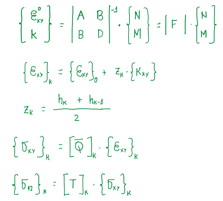 The dimensional case means, passing from fibers to plies, from plies to laminate and, in some cases, from plies to fibers and from laminate to plies. The objective is to understand that once known the deformations on the laminate, it is possible to know the deformations on the plies, which is dependent on the laminate mid plane from the ply times the curvature. The distance from the mid plane is taken as the average of the distances of ply interface ones. If there is strain in each ply, by the stiffness matrix of each ply, it is possible to calculate the stress.