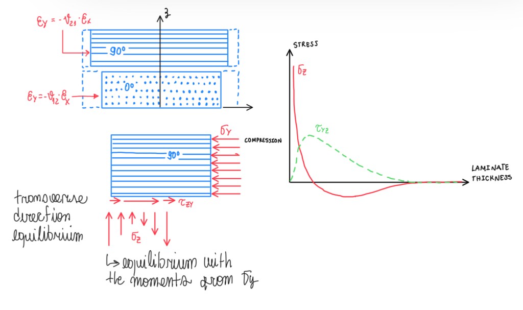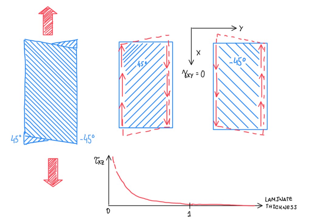 The stresses due to shear deformation mismatch, also called shear disagreement, are illustrated by Figure 4. In this case, the plies are at -45º and 45º, because each single ply are subjected to a membrane load that deforms both in tension and in shear due to the fact that, the fibers are off-axis. The fact that the angles are 90º to the one with respect to each other means that, the shear deformation will be mismatched between the plies. For the deformation equalises, the balanced lay-up has an extension deformation. In other words, there is no shear deformation on the overall -45º/45º composite. Actually, this means that there are shear stresses at the interface, which brings back the two plies to a consistent deformation. In addition, the stresses have a qualitative trend that suggests a theoretic infinite value close to the sides. In other words, these can reach very high values close to the sides and potentially damage the laminate at the interface. Hence, this is a reason why it is advisable to not have very large angles between one ply, the following and the previous one, because it is generated a larger shear mismatch. The larger the angle, the larger the shear mismatch. Those are values of stresses that can not be calculated by the classical lamination theory. Actually, those are calculated by sophisticated algorithms on the finite element method (FEM).