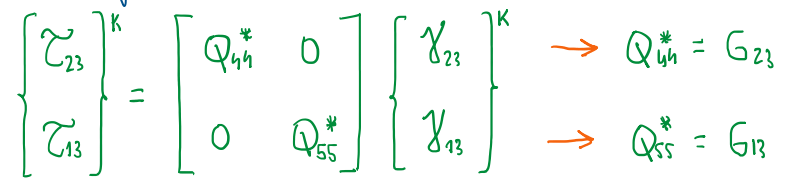 There are some steps for finding the relation between the transverse shear stress and the transverse shear strain for each ply. Where these properties are nothing else than those elastic moduli described in Figure 5. Hence, there is no G12, in this case it is the elastic modulus in-plane G13, the elastic modulus out-of-plane is G23.
