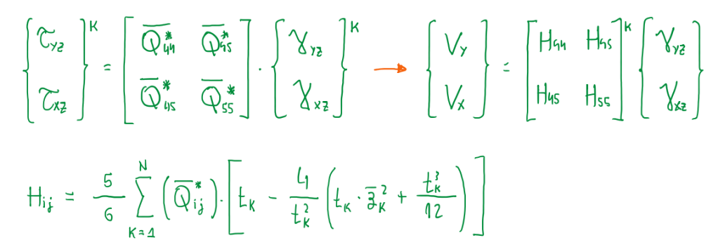 Hence, there are some steps to get the representation of the relationship between shear forces, loads and deformations through a matrix, which are characterized by terms that depend on the shear stiffness matrix of the ply summed over a number of plies times a function of the thickness.
