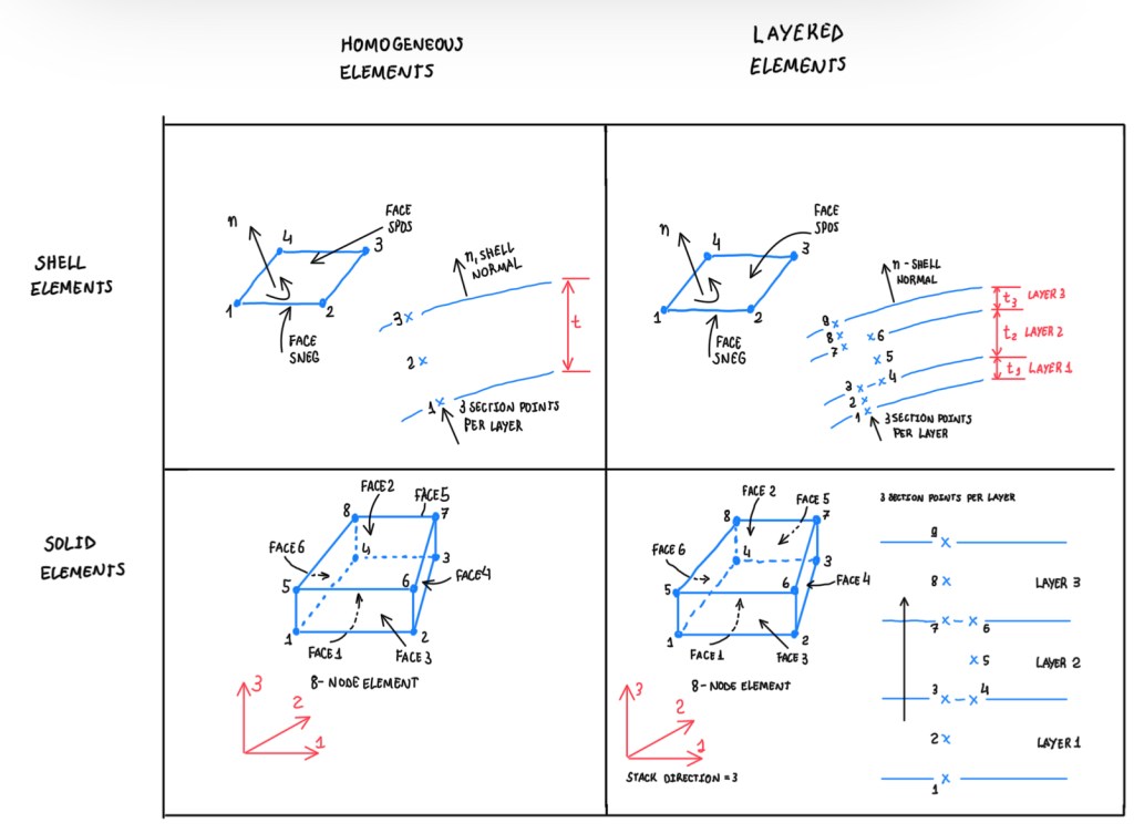 The use of layered elements is similar to homogenous elements. The difference is that, instead inputing orthotropic properties, it is configured the lay-up and defined a material according to its orthotropic properties in its principal material direction.