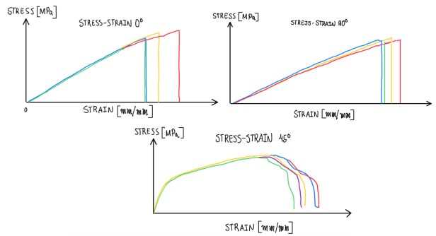 The stress-strain curve for composite materials varies according to the fiber orientations. At 0° and 90° plies, the curves are very similar, both exhibit a brief linear correlation. From this point, fibers adjust themselves according to the loads. After that, there is an increase of the strain in a different slope. Then, the 45° plies exhibit two slopes and a non-linear portion between them. Actually, this case is characterized by shear deformations. Hence, it is possible to confirm that some polymer matrix composite materials and some metals have a plastic behavior of its deformation. In order to create some statistics, the tensile tests are repeated 5-6 times for each fiber orientation. The objective is to build some statistics, curves and properties for the mechanical characterization.