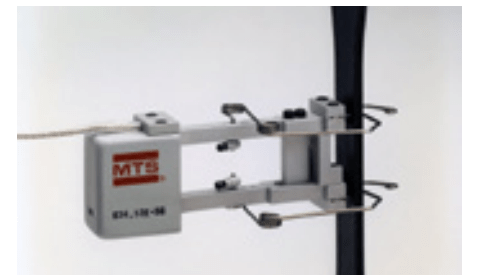 The extensometers are used to measure the strain. Figure 9 illustrates a clip-on axial extensometer under operation, it is placed on the sample surface. Hence, it can be measured the local deformation of the sample. Depending on the gauge length of the extensometer, it is possible to measure different values of the elastic modulus. This also depends on the fact that, with a very small extensometer, as in a strain-gauge applied on the surface, it is measured the strain in a very reduced area of the sample. This means, obtaining a very local deformation of the sample. Hence, for standards measurements, it is usually used 20-25 mm gauge length. This depends on the access available. The 20-25 mm gauge length is sufficiently small to have a local measurement of the strain. Conversely, it is sufficiently large to have a leverage behaviour of the same. Usually, the extensometer information is combined with LVDT transducer one, by dividing the extensometer measurement by its gauge length and LVDT measurement by the free length. Hence, it is possible to have a double check on the two values.