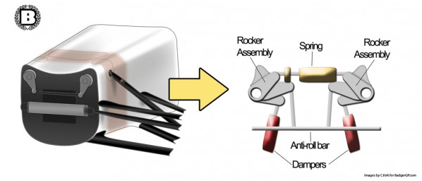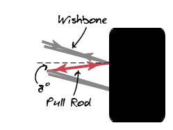 The Pull-Rod configuration works in a similar way, in which the rod (pull-rod or just rod) activates the rocker by pushing it (push), and then the other suspension components are activated. When pushed, the rocker rotates, activating springs, shock absorbers and the inerter, but with the difference that these components are located in the lower part of the chassis.