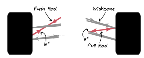 When the drive rod is fixed to the outer end of the lower suspension arm and the rocker arm in an upper position, the suspension is called Push Rod, as the rod pushes the rocker arm, which drives all other suspension components. Similarly, when the drive rod is installed at the outer end of the upper suspension arm, facing the same rocker arm, but in a lower position, the suspension is called Pull Rod, as the drive rod pulls the rocker arm, and this, when moving, activates all other components of the system.
