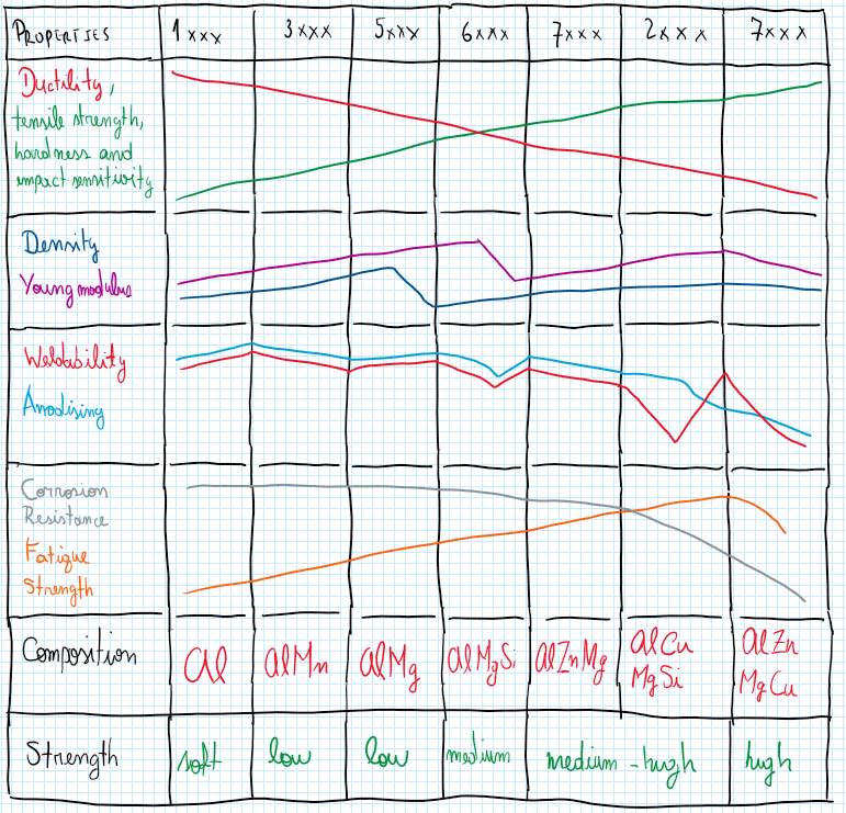 As can be seen the 1xxx series aluminum represents the pure aluminum material. The other classes are all composed by aluminum and its alloying elements. Thus the 2xxx series aluminum alloys called avional, are usually applied on plates and bars and the main reinforcement procedure is the thermal treatment. However work-hardening can also be applied on it. The 3xxx series is an aluminum alloy composed by manganese , it is not so useful for mechanical and automotive design it is usually used by food trays. The procedure of reinforcement is work-hardening. The 4xxx series aluminum alloys are interesting for casting due to the application of Silicon. Finally the five, six and seven series aluminum alloys are the most used for mechanical applications. The inclusion of magnesium (five and six series) increase the corrosion resistance capability. The difference between them is the kind of the reinforcement, work-hardening or thermal treatment ( 5 and 6-7 series respectively ). The most interesting aluminum alloy for automotive application is the 6xxx series, also called anticorodal. In addition the 7xxx series (Ergal) and the 2xxx series (Avional), are also used due to the possibility to be thermal treated.