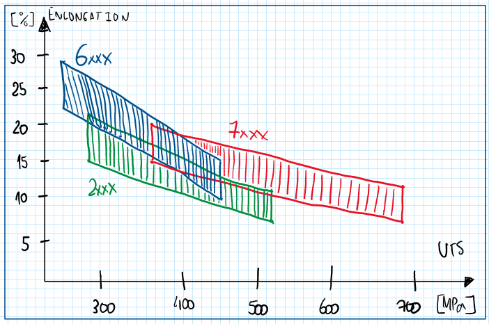 As can be seen on the graph the automotive aluminum alloys have different range of improvement. The six series is the only which presents the best ductility that is the reason why it is mainly used in automotive parts manufacturing. The other two categories, two and seven series, also called avional and ergal, are most used in high performance vehicles manufacturing. The two series aluminum alloys exhibit an intermediate range of elongation and ultimate tensile strength. relative to the seven series aluminum alloys former a higher range enlongation and ultimate tensile strength is obtained , but this material presents a higher strength relative to the other two at cost of a lower ductility.