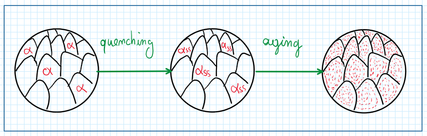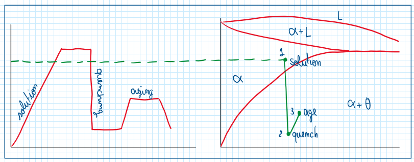 The process begins with a heat treatment called solution, which is the heating of the material until a define the temperature and after this one is reached, it is held for some moment. This improves the solid solution increasing its solubility. After this cooling a very fast cooling is performance this process is called quenching. The cooling heats the material structure obtained after solution heat treatment and modify it to obtain a composition with a super saturated solution. In addition the quenching process is also performed between a range of temperature which are predetermined. After quenching the material is again heated, but this process is called aging. The aging is also held for a defined time. The objective is, by precipitation hardening, improving the material structure, in other words, refining its grains. the reason why aging change the material structure from a fine grain structure is that supersaturated solid solution are not stable.