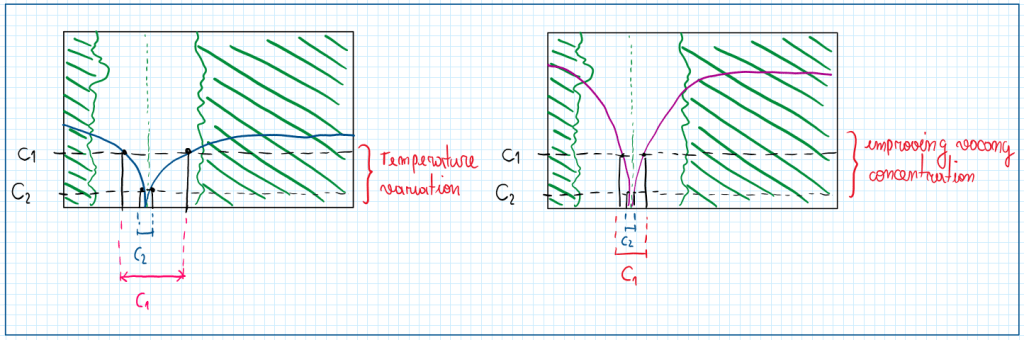 Therefore to improve in aluminum alloy in terms of cohesion resistance there are mainly two ways to obtain the nucleation. One way is working with different temperature variations. In this case it is possible to reduce the concentration of the vacation and then reduce the probability to have a cohesion do it too the different potential. In other words the area with pure aluminum is reduced. an alternative procedure to reduce cohesion yes starting the process with a very high vacant concentration curve , which is usually obtained with gold working. That can be seen in the figure the both concentrations or reduce it, thus the area of pure aluminum is also reduced. Therefore working with optimal temperatures and using cold working it is possible to obtain a reasonable corrosion resistance in aluminum alloy with very high mechanical properties.