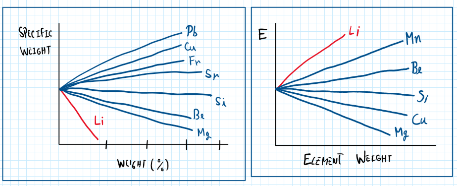 Due to the increase amount of lithium, these alloys are respective to the 8 series. According to the Figure above , lithium additions improves the mechanical properties of the aluminum alloy while the very low specific weight of lifting do not increase significantly the material weight. However , there is a limit which lithium can be used as in alloying element coma until 4% of litter periods. This means that each 1% of lithium results in a weight reduction of 3% and an increase of 6% of young models.
