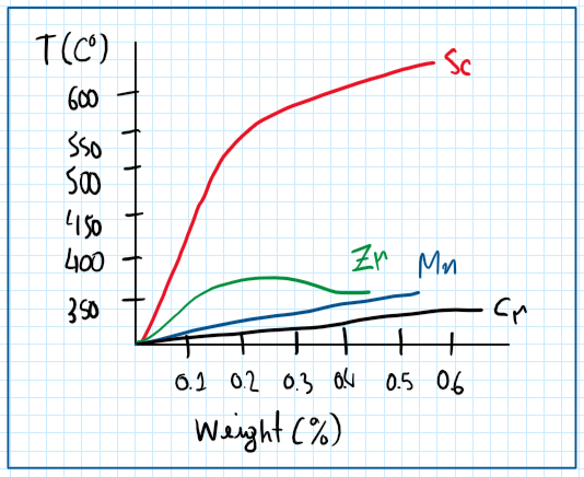 The objective of adding scandium to an aluminum alloy is to increase the mechanical properties. This is obtained because scandium form a supersaturated solid solution after solution heat treatment, then after the temper it is formed a secondary phase Al3Sc. These dispersoids are highly coherent and provides a fine grain structure, thus an increased strength. In addition, as can be seen by the graph, scandium has a very high thermal stability, which motivates a high recrystallization temperature.