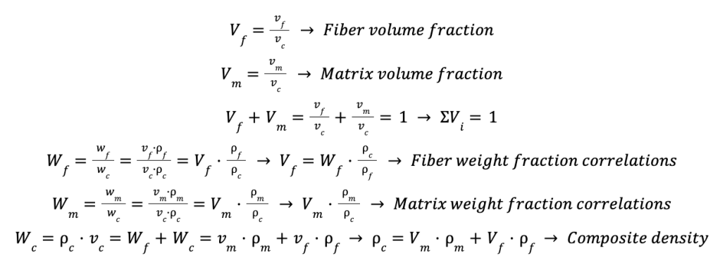 The hypothesis that are behind the usual models are homogeneity, orthotropy, linearity of the constitutive response and the residual stresses. The homogeneity defines that, the properties are evenly distributed over the material. It is not considered a point-to-point variation of the properties in order to simplify the calculations. The orthotropy is a hypothesis that means the existence of different planes of symmetry into the material and the definition of four independent elastic constants. For instance, in the case of a simple isotropic materials, as metals in general, there are just two independent elastic constants, the Young’s modulus and the Poisson’s ratio. The linearity of constitutive response is assumed. It is about 2 for fibers, which are inherently brittle, but also for thermosets or epoxy matrices. These do not exhibit a plastic or non-linear response. The residual stresses may come from the heterogeneity and thermal expansion mismatch, which do not modify the properties that will be estimated, as stiffness and macroscopic strain homogeneity. The thermal expansion mismatch means that, when there are several constituents in a material, generally each of them have a different coefficient of thermal expansion. Hence, the composite material is heated or cooled down, the different constituents will try to expand or to contract at different rate from each other. Since the expansion and the contraction of the whole material is the same, then some stresses will occur in order to keep the material continuity and compensate the thermal expansion mismatch of the constituents. However, this does not affect the behaviour that is estimated. The first equations that should be considered involves volumes and weight fractions and the density of the material.