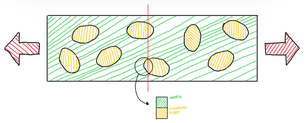 For random oriented inclusions, it is defined two bounds, upper and lower ones. Depending on the orientation of the plane that cuts the composite, the upper bound is found by the plane orthogonal to the forces applied on the composite. If this is cut as seen in Figure 3, then it is possible to spot that at the interface between the matrix and the inclusion working in parallel with respect to the loads. This means that, they are experiencing the same strain, which are equal to the global strain of the composite. This is the assumption made by the Voigt model (Navarro,2017). Therefore, to evaluate the Young’s modulus of the composite, which by definition of a linear elastic behaviour is just the stress divided by the strain, it is possible to write the stress as the force divided by the section of the fibers and the same for the matrix. This means that, it is obtained the ratios Af/A and Am/A, that are basically the volume fractions of fibers and matrices. The reason behind the area fraction becomes the volume fraction is the assumption of an unit thickness and unit length. Hence, the volume is essentially independent on the third dimension. Moreover, the strain is the same for the fiber and the matrix, thus it is possible to substitute either εf and εm by ε. In the end of the calculation, it is possible to observe that the upper bound modulus is just the rule of the mixtures but applied to the Young’s modulus of the material. It is also possible to notice that, this rule is quite similar to the equation of two springs in parallel. This defines that, the total stiffness is the sum of the stiffness of the two springs.