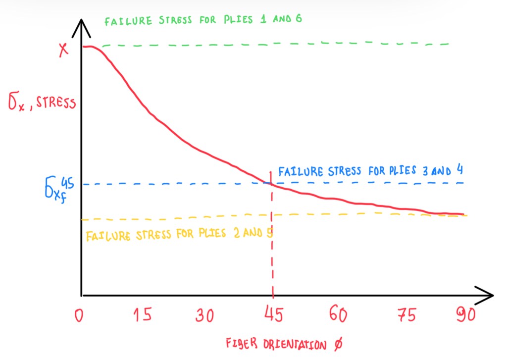 Moreover the failure stress are obtained through a failure criteria. In Figure 2, it is possible to notice that, the value of strength for 90° plies for any type of failure criteria is very low. For 0° plies, the strength is the highest one. In the case of 45° plies, it should be determined what is the failure strength for a wall index direction. This is determined by one of those failure criteria for the plies. Hence, this is a value which is dependent of the orientation of the ply. Therefore, the failure will occur into the plies oriented at 90°, then the ones at 45° and 0°, then in this example the first ply failure is the one at 90°.