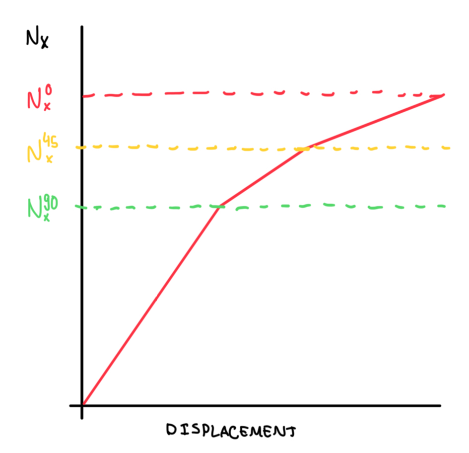 Figure 1 illustrates an example of the first ply failure criteria applied to a symmetric laminate. A force Nx is applied on the x-direction. The first and the last plies are aligned with the loads. The second and the fifth plies are disposed transversally to the loads, thus at 90°. Then, the other two plies are disposed at 45°. This example is a case that, the strains and the stresses can be examined by the X matrix since this is a symmetric laminate. The A’ matrix represents the undamaged condition, because there are plies that fail in there and go through strength. For the loads, which in this case are just N, there are the strengths on the mid-plane, not curvatures. Hence, there are the stresses through the material ply, which depends on the ply work.