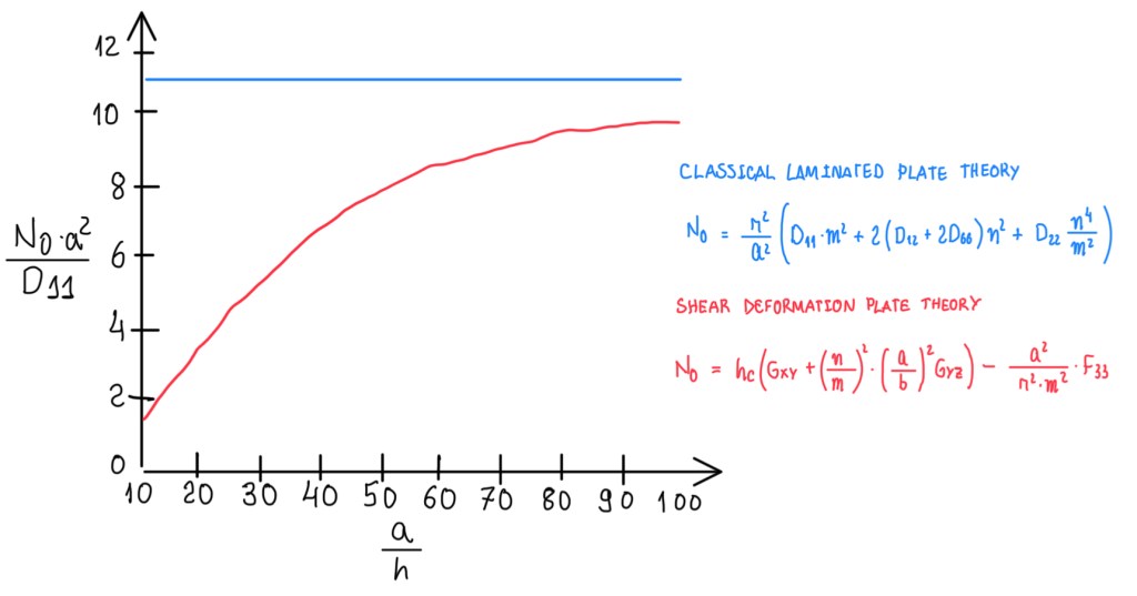 Finally, the solution is the one seen in Figure 10. This depends on the shear modulus Gxz and Gyz, the term F33, m and n. These two have values that make N0 to represent the minimum buckling load. This is typically obtained by m equals to n, which is equal to one. However, in general this condition can not be assumed a priori. It corresponds to a half wave along an unique bullet in two directions. The diagram seen in Figure 10 is just a comparison between a solution which comes from shear deformation theory and the one from the classical laminated plate theory. The first accounts all the contributions due to the shear deformation, while the second theory is simpler and does not include the shear deformations. This is an approximation which can be rather strong in the case of a sandwich plate. For the plate suggested in Figure 10, (0.5 x 0.5)m, subjected to a load N0 in the direction indicated and being unidirectional composite face sheets and an isotropic H100 PVC foam core, the values of all material and sandwich properties are known. In the case of a/h values of 10 means that, the height h is 5 cm for a of 50 cm. Hence, the panel of the example has the dimensions (50x50x5)cm. In this case, it is possible to notice that, the shear contribution lowers very much the value of the buckling load with respect to the one predicted by the classical lamination theory. For one and two orders of magnitude solutions, both are converging. The reason is that, the shear contribution is less and less important, the two skins are coming close to each other. When this occurs, the shear contribution due to the deformation is smaller. The shear deformation in plates is very important also for buckling.