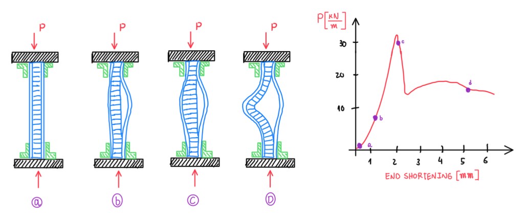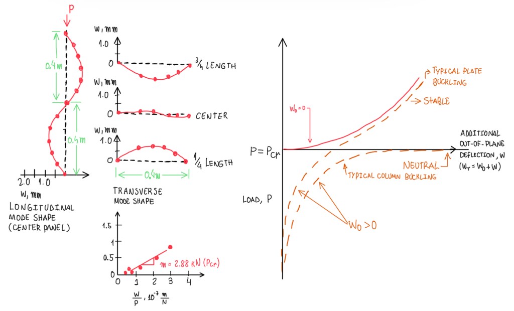Buckling is not the same when occurs in plates, beams or columns. In beams, if it is verified the out-of-plane directions “w”, it is possible to notice that can be, apart of the total out-of-plane deformation, the structure that exhibits an initial out-of-plane shear deformation “w0“, or a geometrical defect. Hence, the total deformation will be given by the deflection due to buckling plus the one due to the initial deformation w0. However, in any case which w0 is equal to zero, if this occurs in columns, then this remains straight until the buckling load, then it deforms at constant load. The plates exhibit an out-of-plane deformation which increases, but the load also increases. The presence of an initial defect does not change significantly, because in the case of columns (Figure 11, dashed lines) at certain point it gets close to the buckling loads, then stiffness is almost zero. A horizontal line means that, the stiffness is zero, the ratio between the increasing load for an increasing deformation is zero. Hence, the stiffness comes to zero. In the case of a plate, the stiffness decreases, then re-increases. Therefore, the buckling of a plate is a kind of stable buckling, because for a rectangular plate the deformation may occur along the mid-plane and in one direction. However, in the transverse direction there are deformations that goes from zero to a maximum value in the middle, then it returns to zero. At this node (Figure 11), the deformation goes again to zero. Hence, basically, the plate is working as there are two external strips that tend to resist to buckling. In addition, there is an internal strip that tends to buckling. This is the way that a such behaviour has some stiffening after the buckling load. Therefore, the final failure of a buckling plate occurs when the external strips collapses, then everything collapses. The small diagram seen in Figure 11 is an experimental way to determine what is the critical load for this type of buckling. If the out-of-plane deflection is measured, it is put as function of the out-of-plane deflection divided by the load, w/p, which is the out-of-plane compliance. Then, it is generally got points along the straight line where it is demonstrated that, the slope of the straight line is approximately equal to the value of the critical load. This is an approach to estimate the critical load form an experimental test.