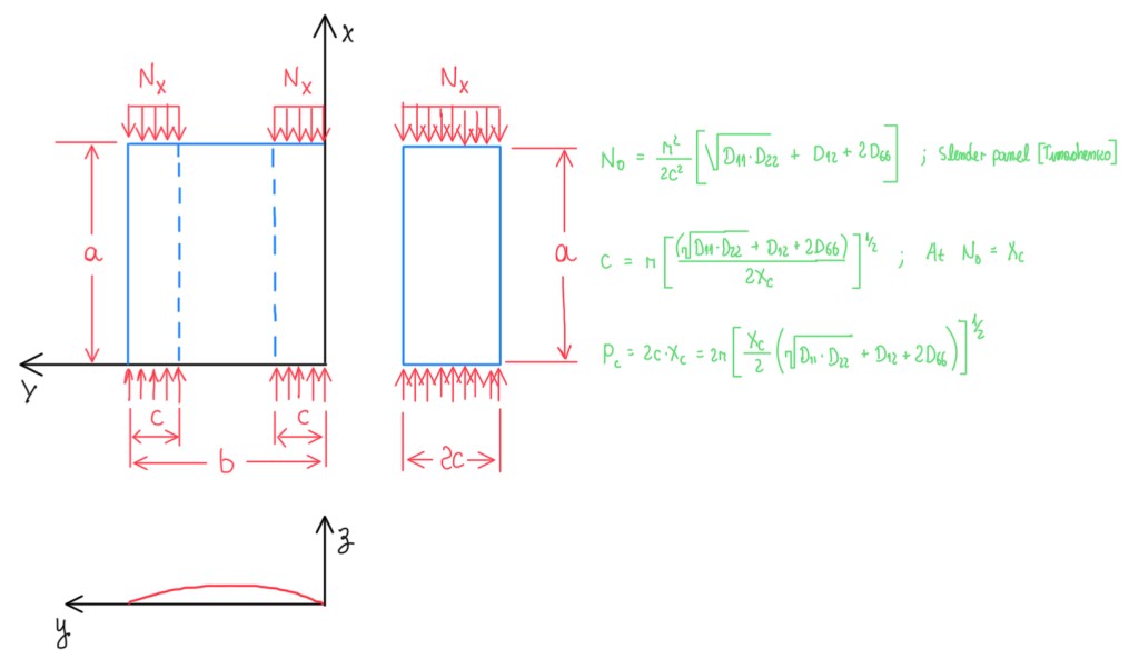 The critical load is not the last load, actually it is the ultimate one. This can be estimated when the two strips, those that resist to buckling, collapse. In other words, they reach the ultimate strength of the sandwich. Assuming that the panel is made by two strips, the lateral ones, which resist to buckling, and the center ones, which is under buckling condition, it is possible to consider that the load is mainly carried by the external stripes. Hence, the stiffness of the central strip, that resist to buckling, is negligible. Hence, all the loads are transmitted to the external stripes. Those are given by a length “c”, then the panel can be reduced to a panel under compression Nx and that has width 2c. Therefore, when this panel collapses, it will occur the collapse of the hole panel, because the central strip has already buckled. The value of the collapse load can be estimated from the formula for N0 seen in Figure 12. It comes from the instability of a slender panel, from the Timonschenko plate theory. If the value of the buckling load is equated to the one from the material strength, then it is possible to make an estimation of the length of the two stripes. In addition, from this estimation, it is possible to get the value of the collapse load, which is two times the length and the value of the strength of the panel. The strength is intended as the whole thickness of the panel, which is done by the two skins and the very small part of the core. This is the value that can be determined experimentally by the edgewise compression test. Once Xc is known from this test, then the collapse load can be calculated. It means that, first it is obtained the value of the stable buckling. Then, at the collapse value Pcr, it drops to zero, because the collapse of the entire structure occurred. This is something that can be managed by theoretical means of the buckling of panels.