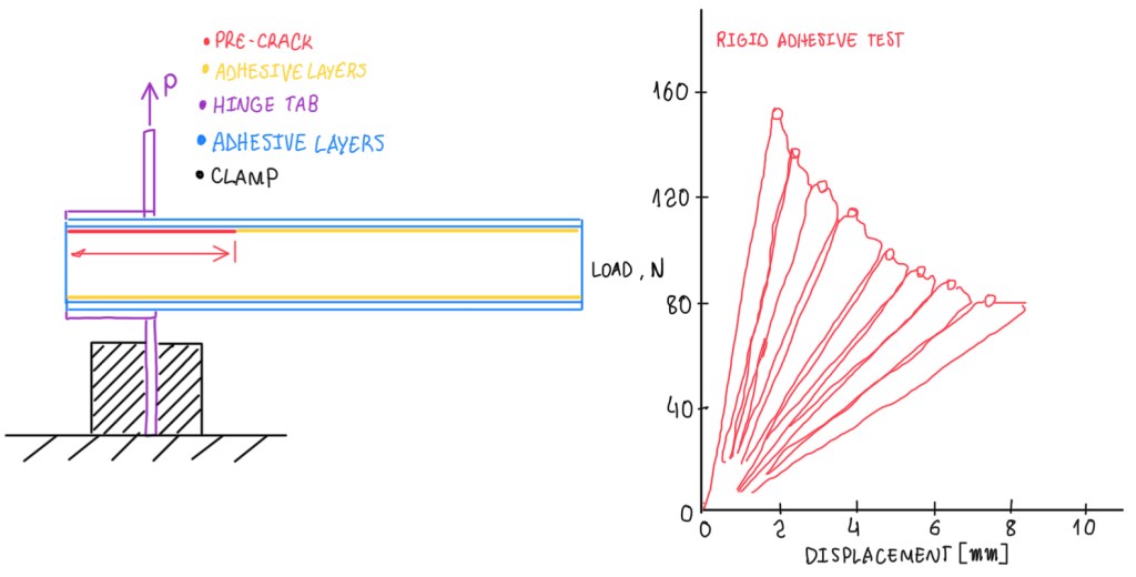 The skin/core debonding is a test to evaluate the fracture toughness. This test is very similar to the double cantilever beam test for the delamination fracture toughness of the composites. However, in the case of skin/core debonding, the delamination occur between the skin and core. The test is done for partial unloading and re-loadings. Hence, it is possible to measure the compliance during the test, because the slope of each of the lines seen in Figure 13 is the compliance of the specimen at different values of the crack length. Along each of these increasing load paths, there is a crack propagation. Hence, each of these points has a different value of the crack length. From compliance, the crack length can be determined and from load and displacements of the load points of the crack length, it is possible to find the fracture toughness.