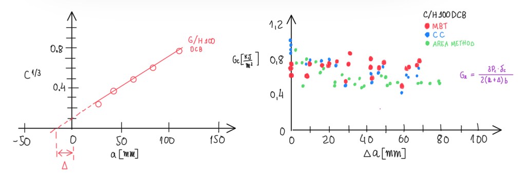 Figure 14 illustrates an example of a standard test (ASTM). It is possible to notice three different methods of evaluation of GC, but the results are about the same scatter ones. However, in the right-side (Figure 14), it is possible to notice a reasonable scatter, because this is an interface and fracture toughness on it can be very much influenced by the fact that, at some points there is the failure of the core, at the other the failure of the adhesive can occur and the failure of the interface between the adhesive and the skin. Hence, it can be much more valuable than the fracture toughness defined in the delamination test where there are two plies of the same material which are compacted without adhesive in between. This is something typically seen in adhesive joints, that the variability in fracture test is rather large.