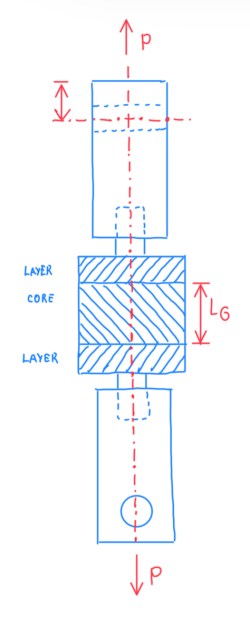 Another test is the direct measurement of the shear strength of the core material. However, this type of arrangement is not very common. In this one, the core material or the entire sandwich is bonded on metallic plates, which are loaded in shear. To measure the strain there is a linear transducer. Hence, it is possible to find the relation between the shear stress and strain. This one is just the shear displacement divided by the height of the core material.