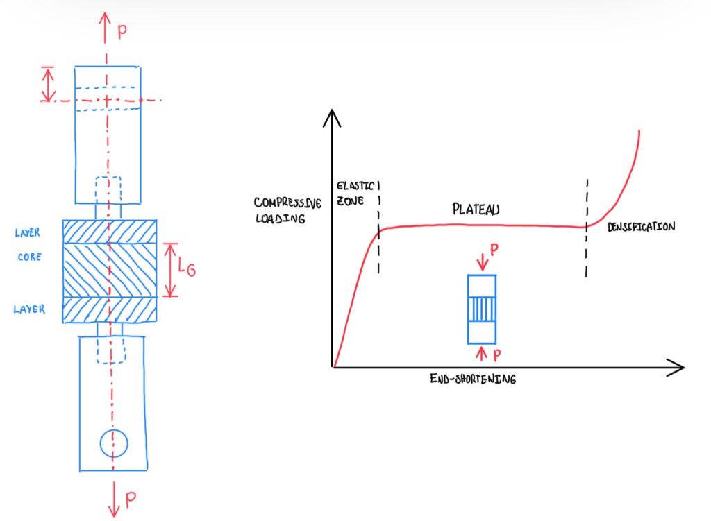The compressive strength test is performed on the same arrange that the flatwise one. In compression test the limits for the core has to be defined. However, for foams or honeycombs, generally the stress-strain curve is very similar to the one seen in Figure 4. In the beginning of this curve, it is found an elastic behaviour followed by a plateau. Subsequently it is seen a stiffening when the material is experimenting a strain close to a compaction of the material. The plateau means the buckling of the sidewalls of a honeycomb or the buckling of the cell wall of a foam.