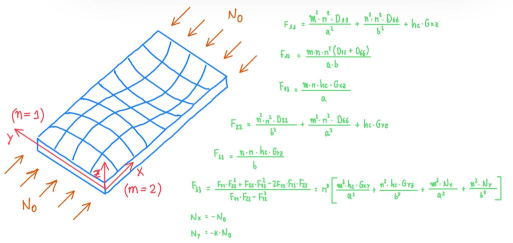 The buckling of panels may be important in several applications, because initially any geometrical imperfections that occur in a large panel can result in small instabilities when compressive loads are applied. In two dimensional structures, there are no instability as in beams. In these cases, if a beam is pushed in a point, there is a sudden instability. This occurs because a beam is an one dimensional structure. For a two dimensional structure there is no sudden instability like that, but there is some out-of-plane deformations that develop first. There are other out-of plane deformations which suggest that, the structure is not working well. There are some limitations due to the possibility to perform an analytical calculations. The series of equations seen in Figure 9 are just a sum of terms which depend on flexural stiffnesses. The terms D11 and D66 are those seen in the matrix of the stresses in the face sheets and core of the sandwich plate (Figure 9), which determine the stiffnesses of the skins which are spaced apart from a distance equal to the thickness of the core. The term Gxy is the shear modulus of the core, a and b are the size of the plate in x and y directions and m and n are the buckling loads along x and y directions. For instance, a half wave seen in Figure 9 corresponds to the first mode of buckling. This can be seen in a simply supported beam when compressed. The buckling mode is like an arch from one hinge to the other, which is a half wave of periodic function that represents the buckling displacement. Hence, a half wave is the first buckling mode, thus a complete wave is the second one. If there are higher modes, the waviness is more and more pronounced. All these terms are combined together in the F33 term. For the instability point determination, F33 is equated to the equation seen in Figure 9. The forces Nx and Ny are the ones that compresses the panel in the suggested directions. Then, the final equation, which is taken out of that, is developed for cases of proportional loading. This is the case where Ny is proportional to Nx, which is basically a compressive load N0.